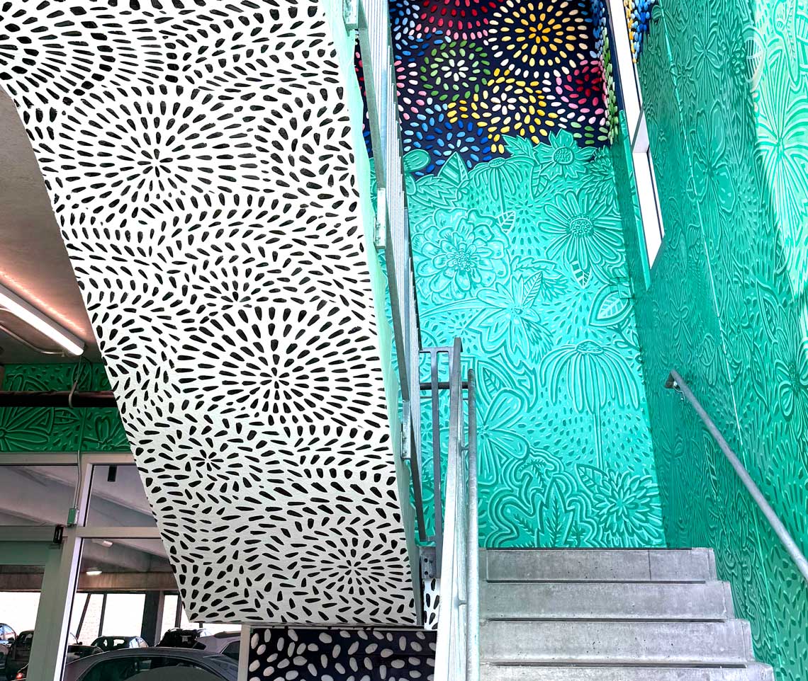 The interior staircase design draws inspiration from native Merriam plant life, illustrating a pattern of growth that ascends up the stairs. The top of the walls feature sculptural papercrete elements that form intricate, multicolored bursts of color – hand-painted with the help of community members. Vinyl patterns applied to the windows interact with natural light, adding depth, dimensionality, and a sense of movement to the overall piece. Grow Together reflects the spirit of this Merriam gathering place – a space where creativity and community thrive. |